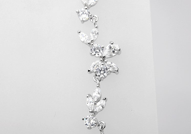 An awe-inspiring piece! This shimmering piece has a garden inspired look that you'll surely love. The whole piece is wrapped around with CZ diamond stones, where it each is carefully molded into flowers and leaves that are in harmony with the oval-shaped CZ diamond in the center. This necklace is perfect for grandiose occasions like an anniversary date or a prom night.- Material: 18K White Gold Plated Copper